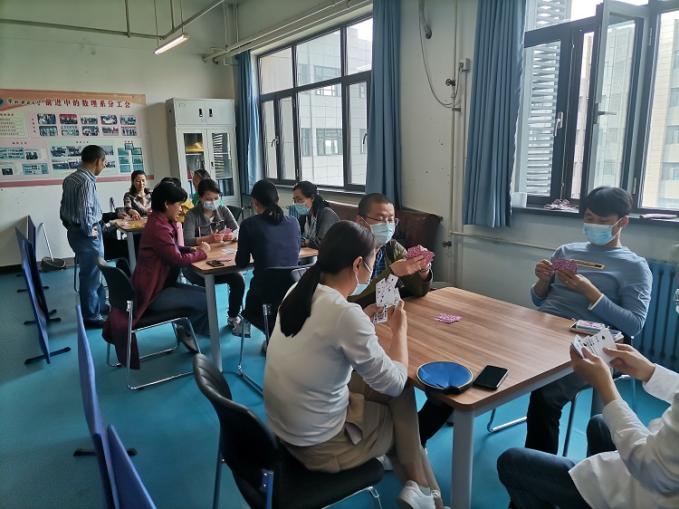 本次比赛共设有象棋、扑克牌两种项目。根据报名人数分成若干小组,组内循环积分。每场胜者积1分,负者积0分,总积分高者胜出。本次比赛共有42名教职工参加,老师们齐聚一堂、围桌酣战,展开了激烈的较量。比赛中,参赛选手搭档之间通力合作、默契配合、沉着应战,对阵双方谨慎思考、斗智斗勇、乐在其中。现场气氛欢乐融洽。最终,经过层层角逐,比赛共产生一等奖5人、二等奖13人、三等奖24人。